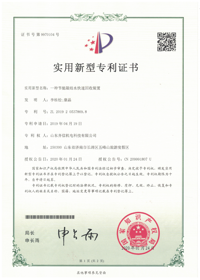 凝結水回收裝置專利證書