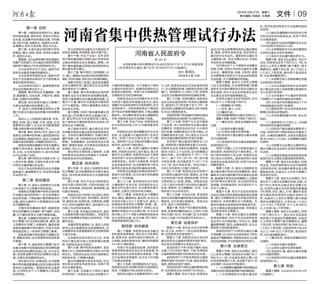 《河南省集中供熱管理試行辦法》已經(jīng)2017年11月8日省政府第142次常務(wù)會(huì)議通過,現(xiàn)予公布,自2018年4月1日起施行。