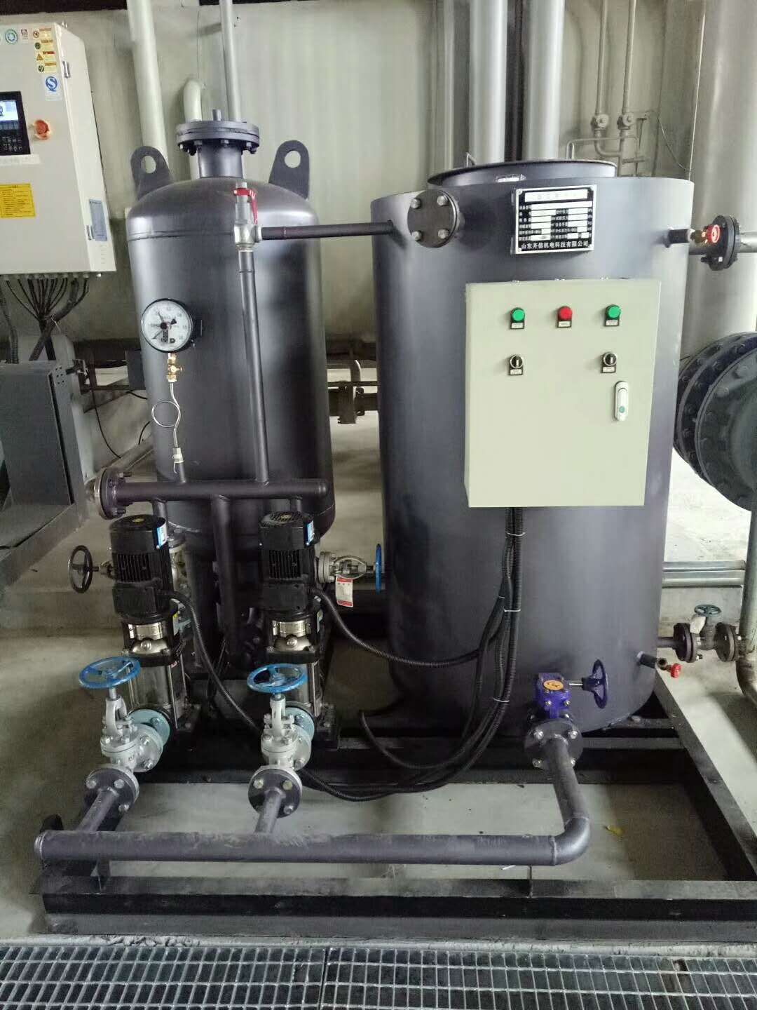 在閉式循環(huán)系統(tǒng)中,為了保證系統(tǒng)壓力的穩(wěn)定,需要設置穩(wěn)壓膨脹器設施。當系統(tǒng)壓力降低時,與其連接的氣壓罐的水室壓力也隨之下降,氣室體積擴張,壓力亦隨之降低,到控制系統(tǒng)設定下限時,自動開啟水泵,向系統(tǒng)補水,直到達到設定壓力上限,水泵停止運行。當系統(tǒng)中水受熱,溫度升高,體積膨脹時,擠壓氣室,壓力系統(tǒng)壓力升高,到限定值時,系統(tǒng)里的水就會通過安全泄壓裝置到膨脹器(或軟化水箱),系統(tǒng)壓力也隨之下降到設定值,停止泄壓。