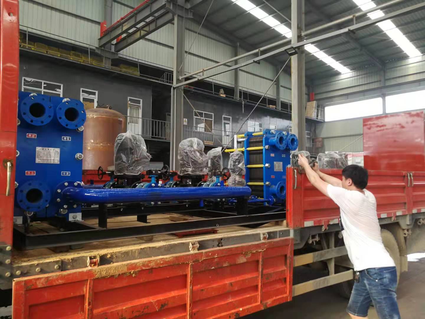 齊信機(jī)電為山東齊眀置業(yè)有限公司天健苑小區(qū)冬季供暖用的兩套換熱機(jī)組按期制造完畢,經(jīng)公司質(zhì)檢檢驗(yàn)合格,按照合同約定今天裝車啟運(yùn),同時(shí)派出4位經(jīng)驗(yàn)豐富的安裝技術(shù)工人到達(dá)現(xiàn)場(chǎng)進(jìn)行設(shè)備就位和管道安裝。