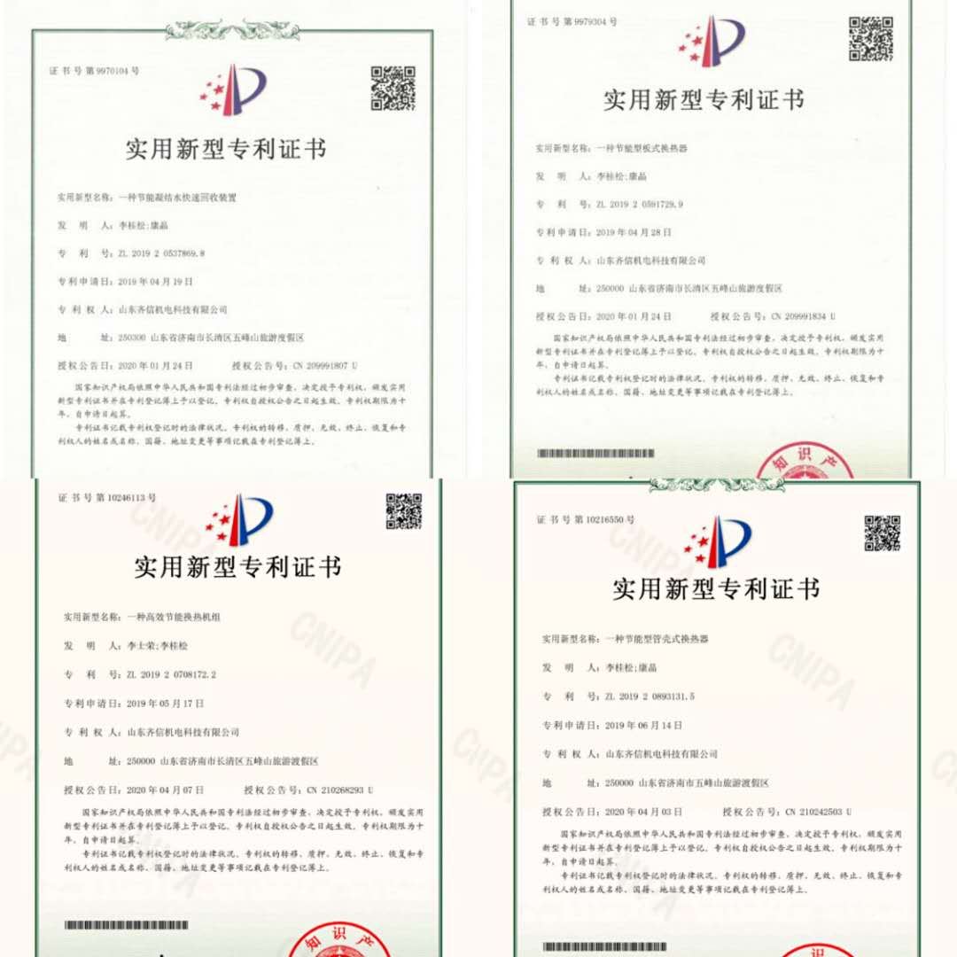 山東齊信機電科技有限公司是一家集科研設計、制造、安裝于一體的制造企業(yè)。近日憑借專業(yè)精干的技術研發(fā)團隊先后榮獲國家知識產(chǎn)權局頒發(fā)的4項專利證書,分別是一種節(jié)能換熱機組、管殼式換熱器、板式換熱器和凝結水回收裝置。